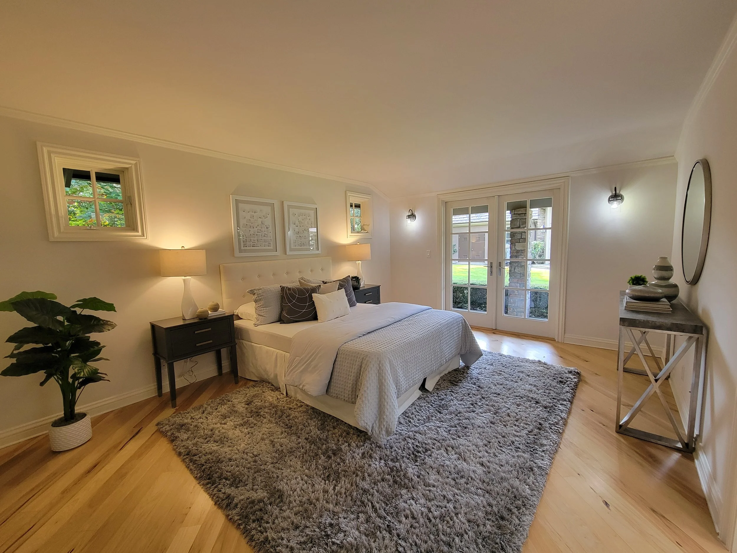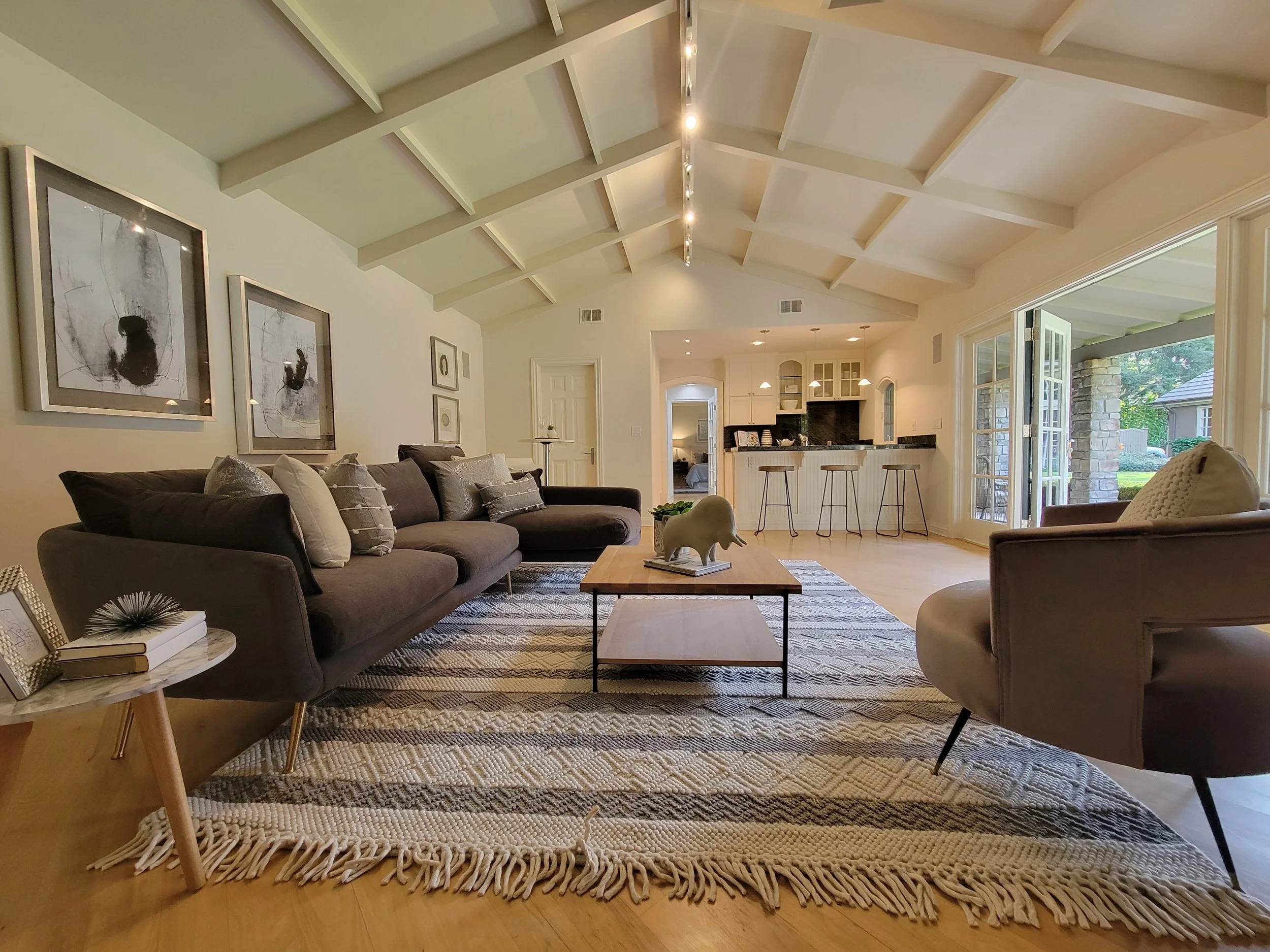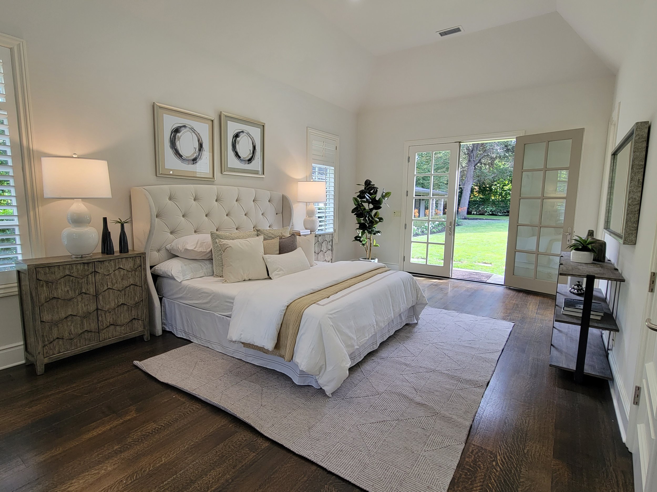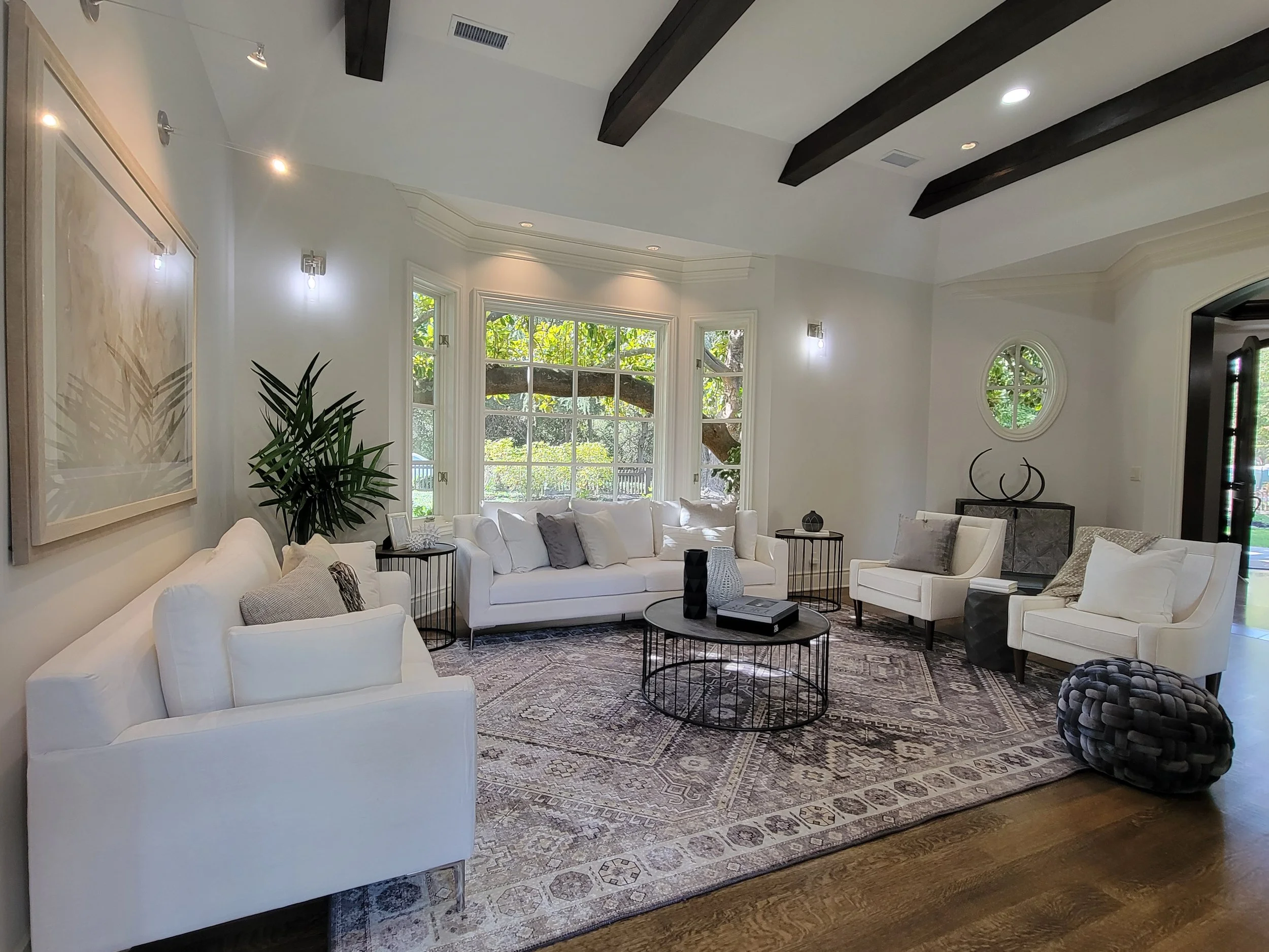 This four-bedroom home in Atherton blends multiple styles to create a uniquely beautiful home. The staging was designed to highlight the high ceilings and complement the merging of styles.