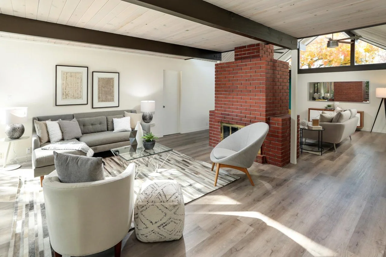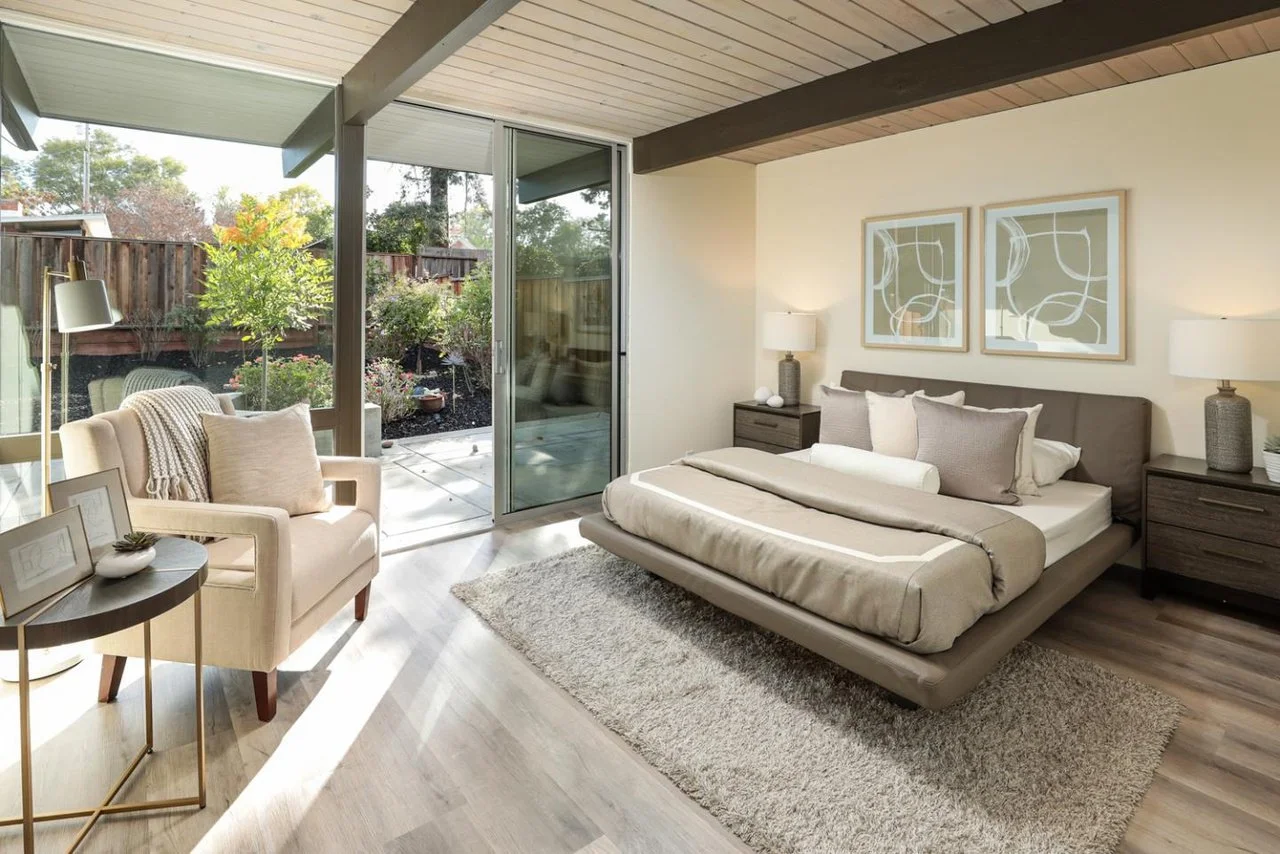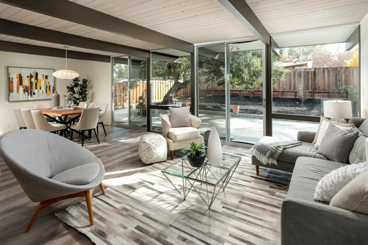 The staging designed for this four-bedroom Eichler home in Sunnyvale accentuates the style with classic mid-century modern colors and furniture while adding pops of contemporary pieces.