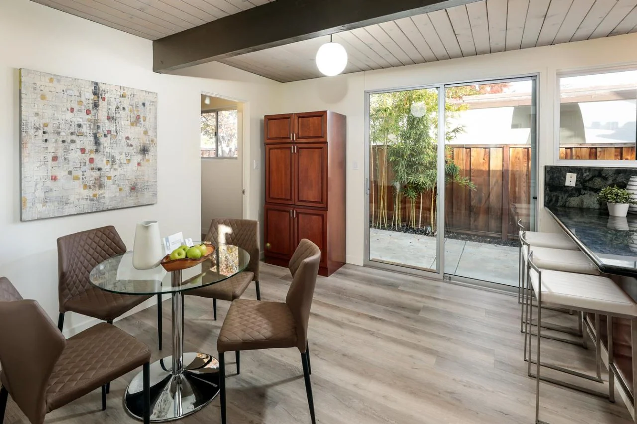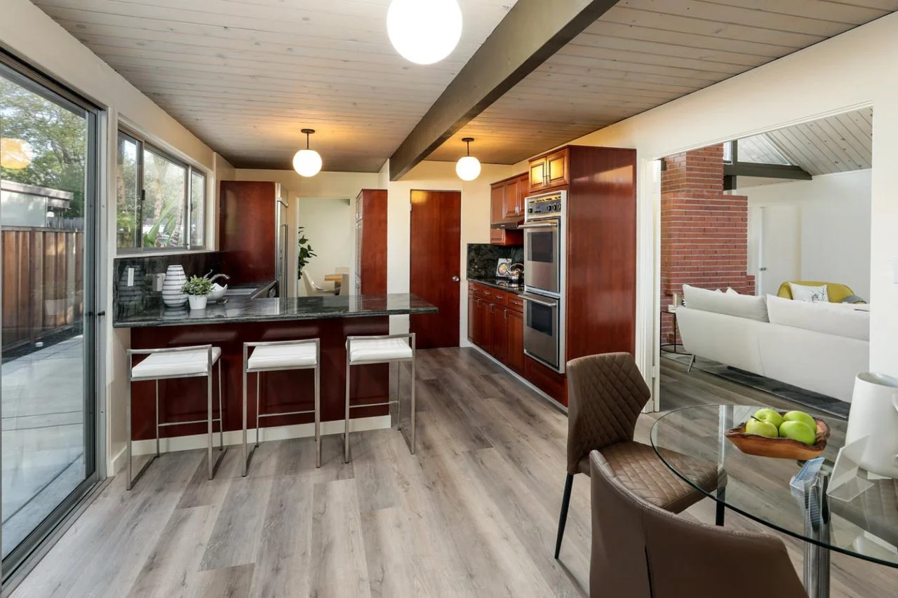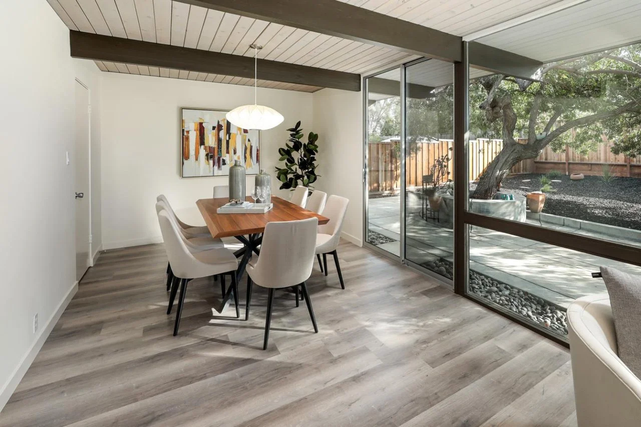 The staging designed for this four-bedroom Eichler home in Sunnyvale accentuates the style with classic mid-century modern colors and furniture while adding pops of contemporary pieces.