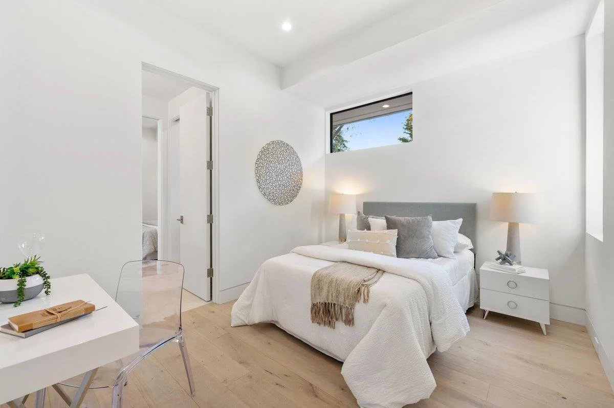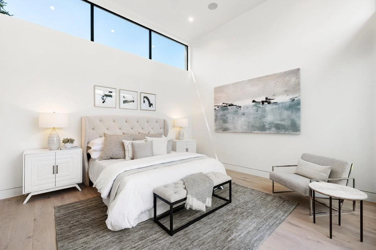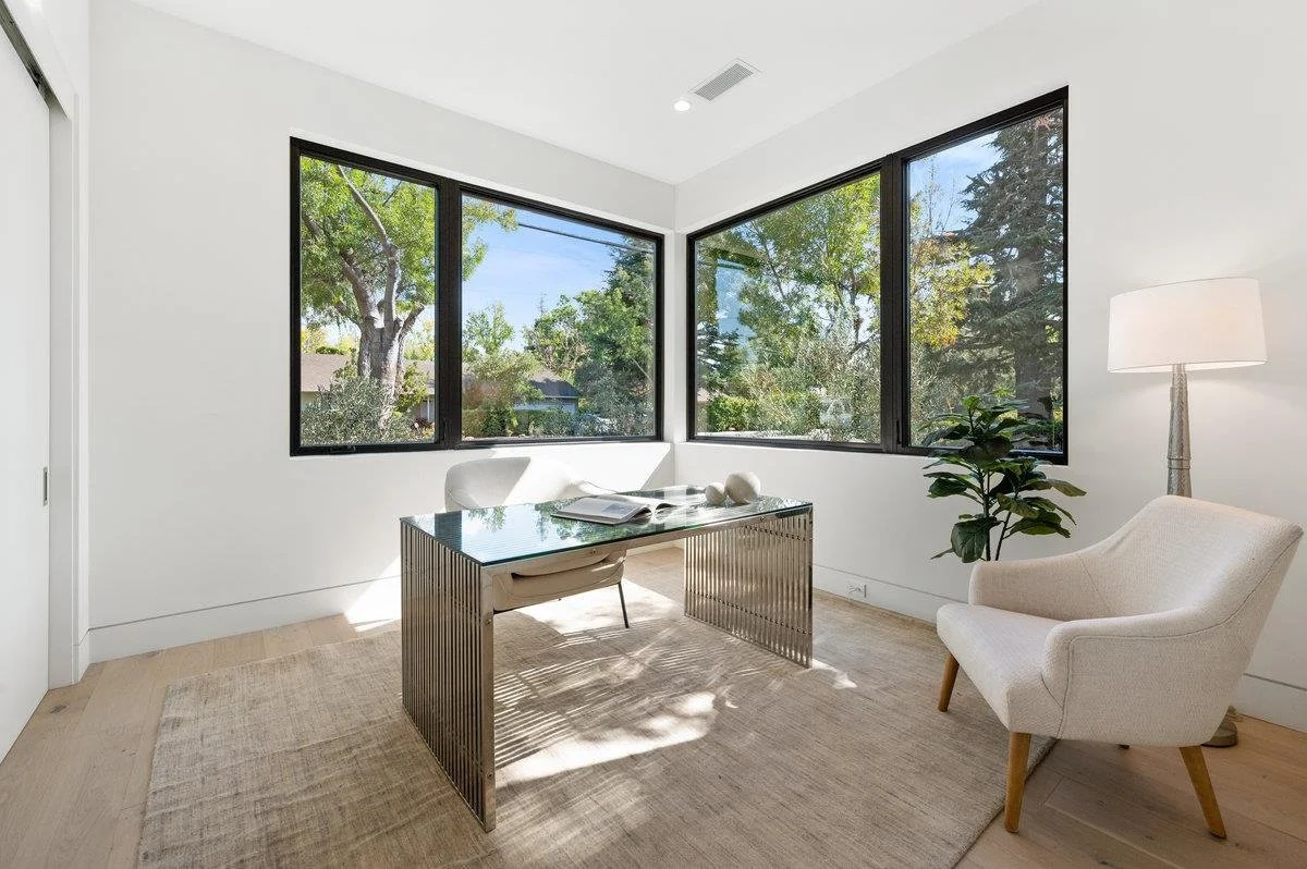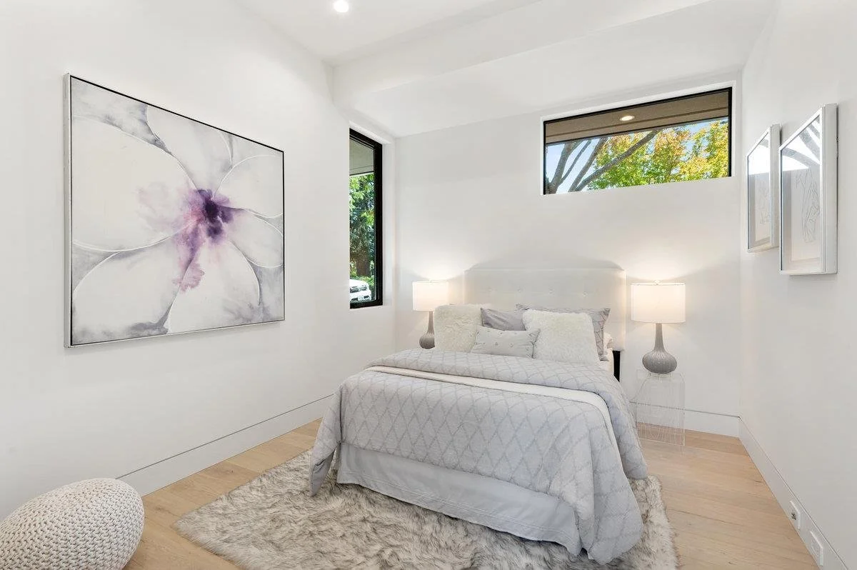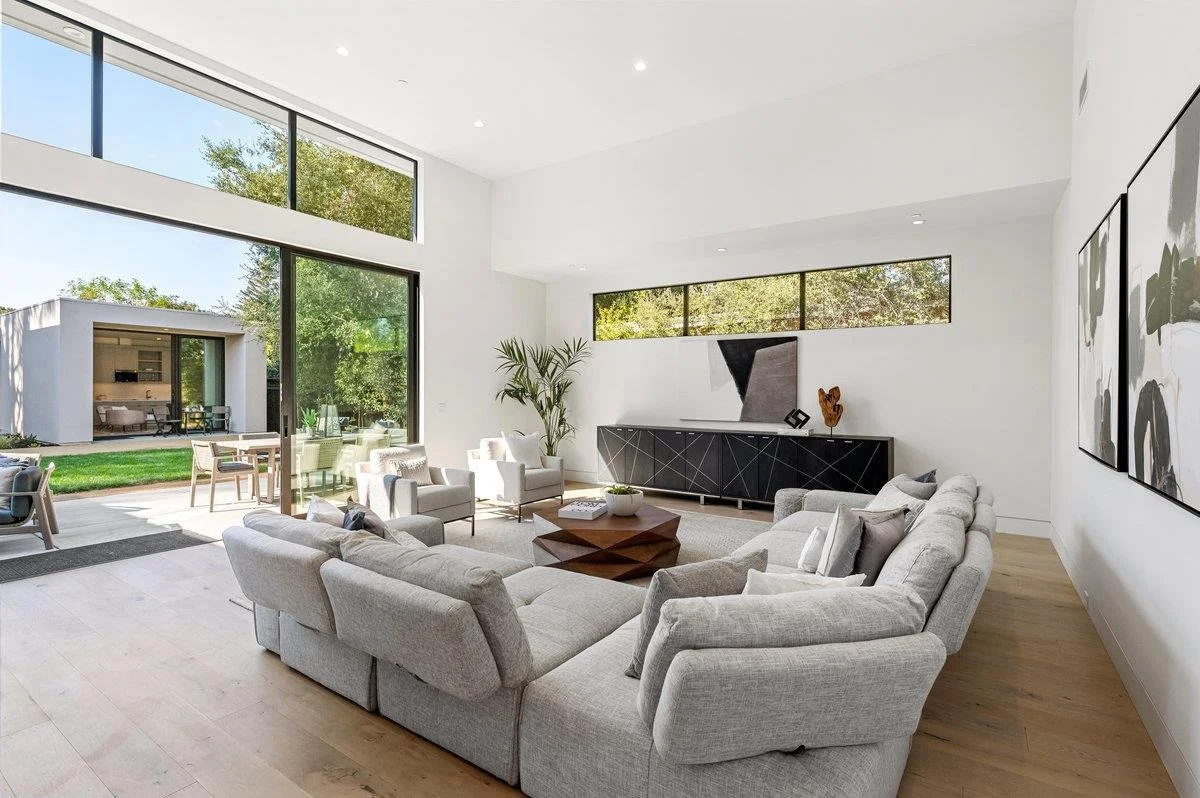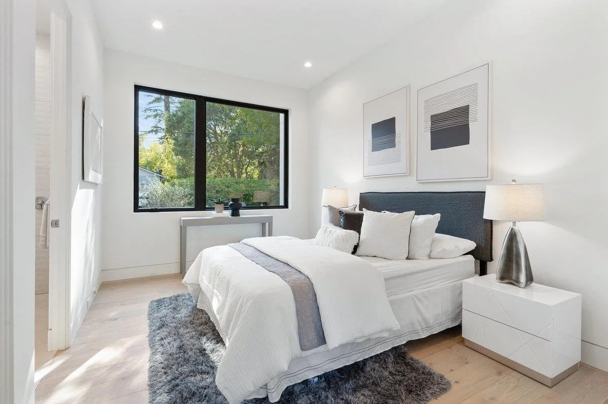 This large six-bedroom home in Menlo Park shows off a minimalist style, ample natural light, and vast living and dining areas. The staging was designed to enhance the modern style of the house and show off the large scale of the social rooms.