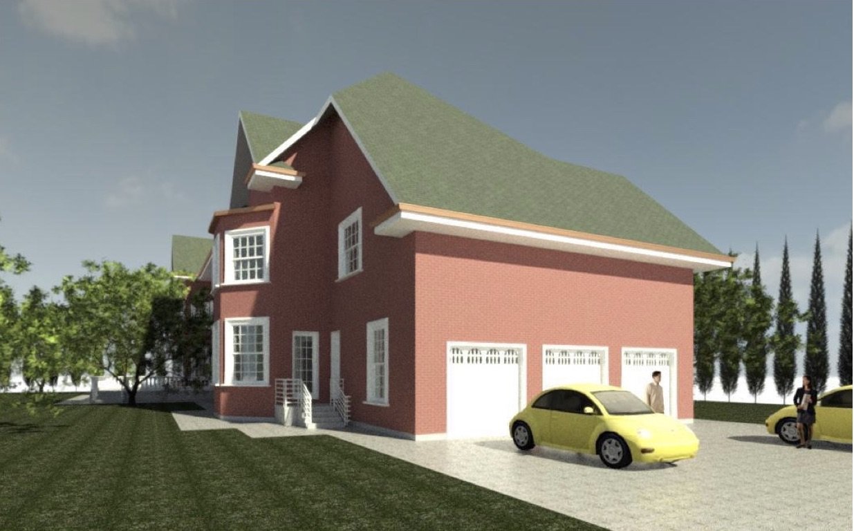 The instructor provided students with base plans of a two-story residence with a basement and attic. Students were responsible for completing a full 3D model and a drawing set, which included a site plan, a floor plan for each level, one elevation, and three renderings.